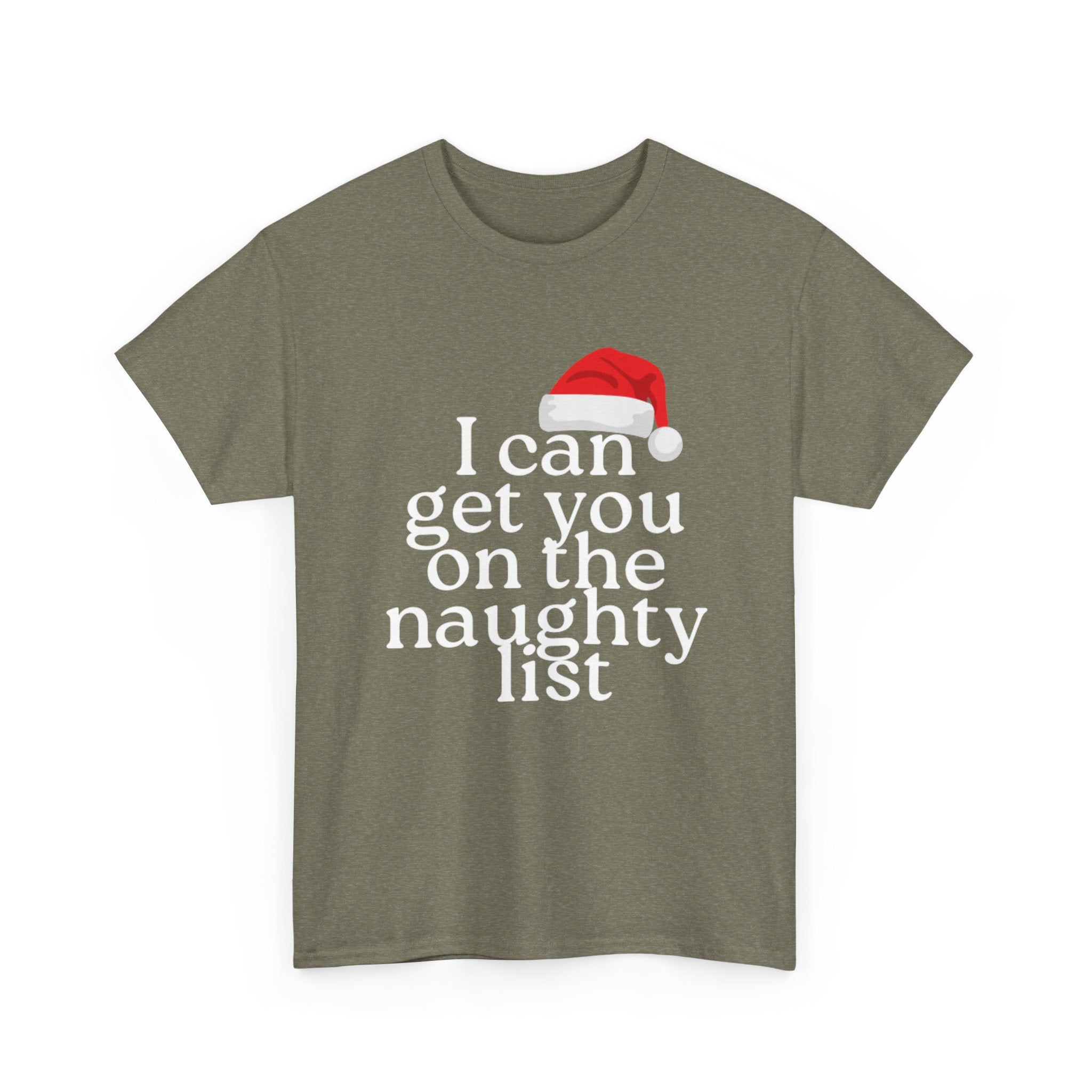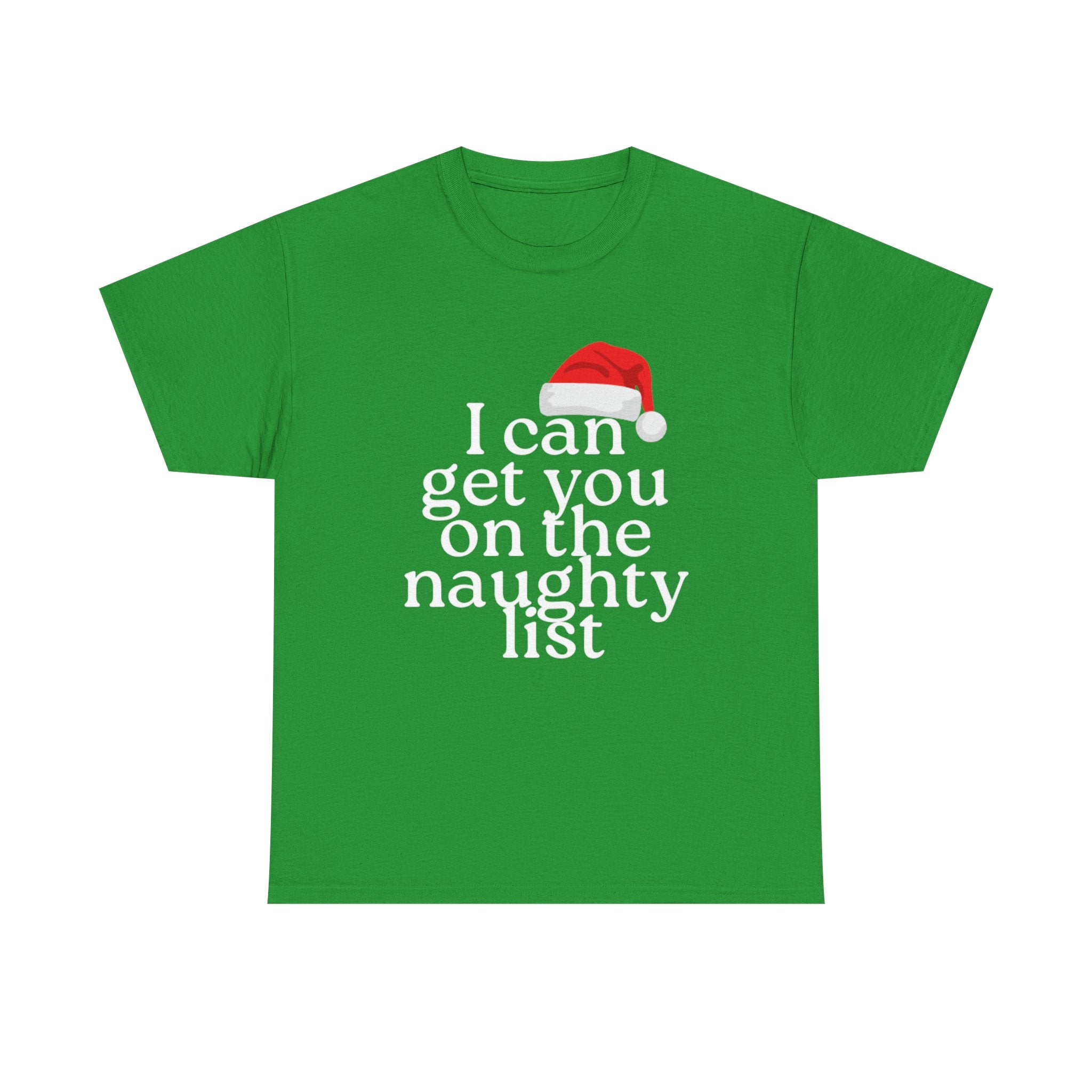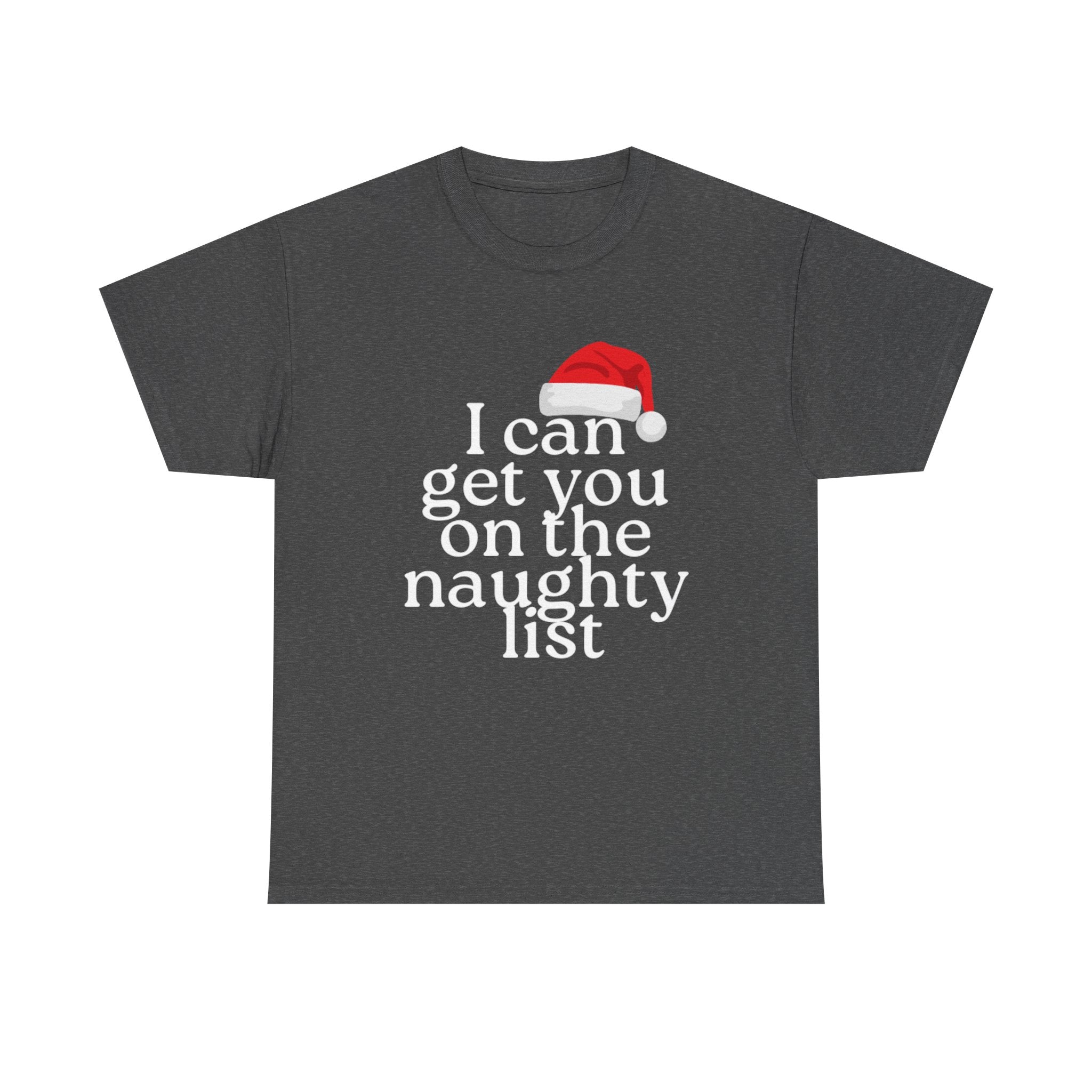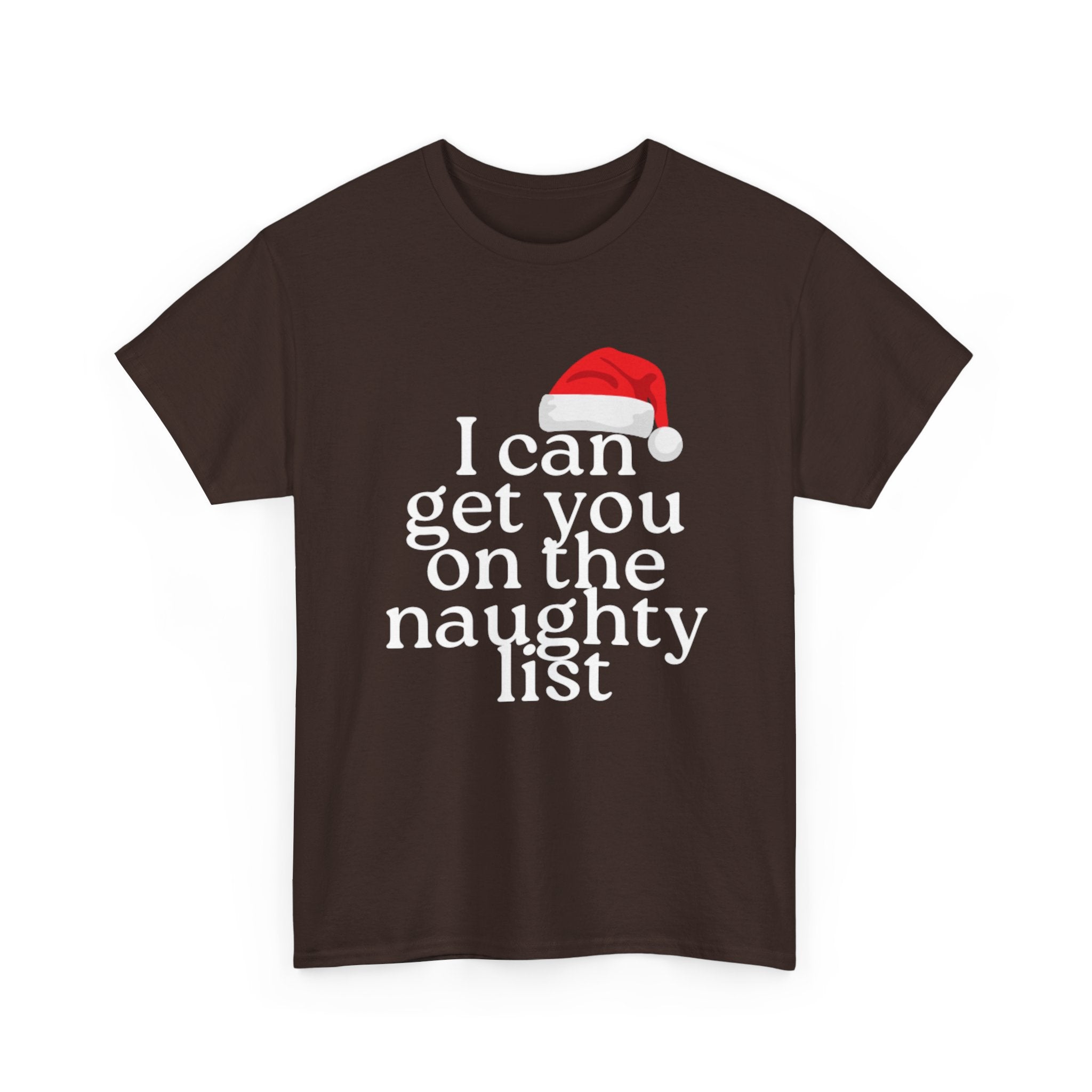 This short-sleeved tee carries a cheeky wink — the line “I can get you on the naughty list” reads like a playful promise. Lightweight yet sturdy 100% cotton drapes easily over the shoulders and keeps the silhouette classic and unfussy. Wear it on brisk evenings at holiday parties or layered under a jacket for a night out when you want to push the mood a little. It’s the kind of shirt that sparks a grin, invites a flirtatious remark, and settles into rotation for cozy seasonal hangs and mischievous moments.
